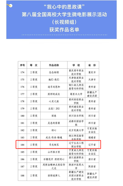 1月7日,由教育部办公厅组织的习近平新时代中国特色社会主义思想大学习领航计划主题教育活动获奖名单公布。在“我心中的思政课”——第八届全国高校大学生微电影展示活动中,由马克思主义学院教师孙威、李响、高璐指导,环境设计学院数字媒体艺术设计232班王圣嘉等学生团队创作的微电影作品《寻光相见》荣获长视频组三等奖。本次活动从全国1006所高校提交的3134部微电影作品中共评选出366项作品,其中特等奖18项,一等奖52项,二等奖112项,三等奖184项。